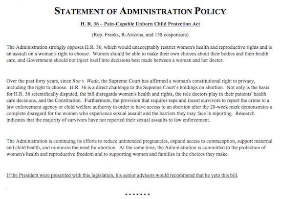 The second and more controversial threat was issued over H.R. 36, a 20-week abortion ban. (The 20-week marker refers to a widely-disputed theory of when infants can feel pain.)