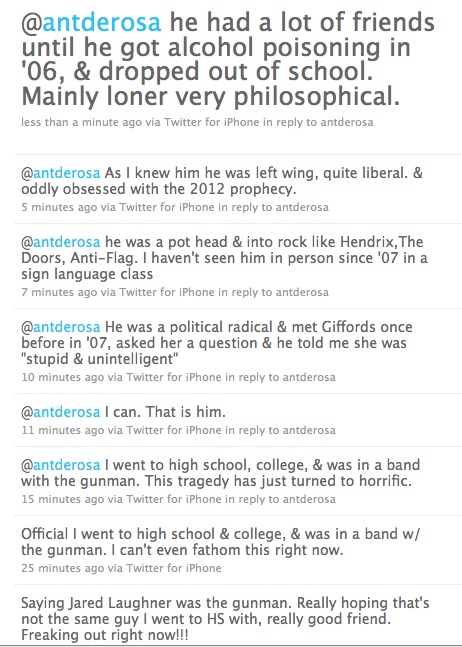 Update #2: An individual named Catie Parker claims to know Mr. Loughner from High School and offered the following unconfirmed insight (via Anthony DeRosa)
