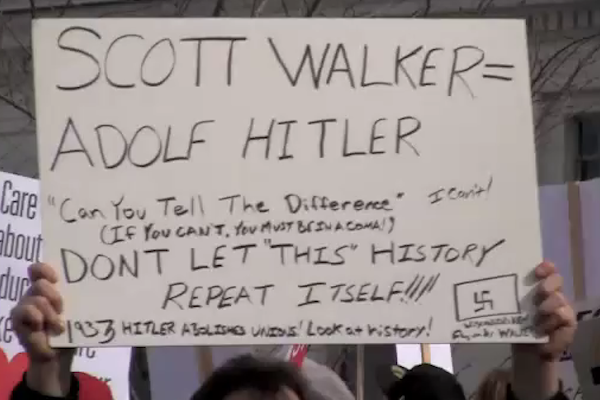 Side note: Are there really still people out there who are slapping a picture of Adolf Hitler on a sign and saying, “Yep, this is a good idea! This won’t make me look ridiculous at all!” Comparing Walker (or Obama…or Bush…or Bieber…or whomever) to a Nazi isn’t just reductive, it’s also he hoariest of cliches.
