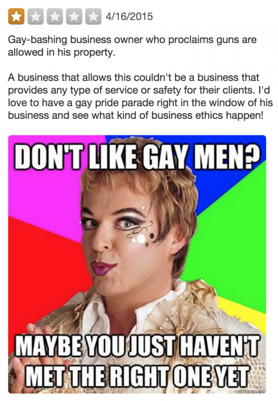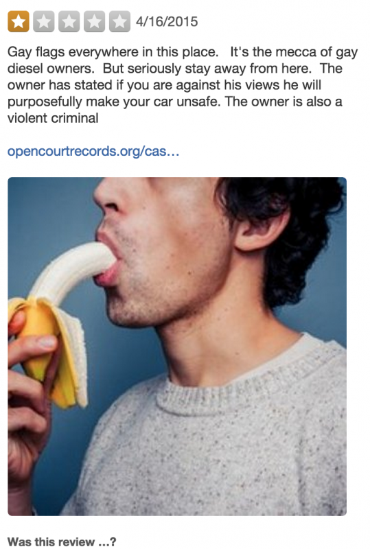 Klawiter’s Facebook comment got national attention for its bluntness (“I would not hesitate to refuse service to an openly gay person or persons. Homosexuality is wrong, period”) and its additional offer for a gun owners’ discount (except for cops with guns purchased with taxpayer dollars). And with that, people flocked to the Yelp page of his auto shop, Dieseltec, to complain (and make gay puns):