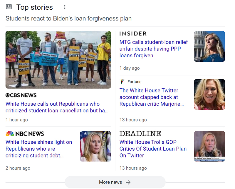 So not just burns as bribes, but like the loan forgiveness plan itself, the dunkfest is a bailout. It’s bailing out the Blue Check horde from the necessity of weighing in on the pitfalls or shadiness of the election-adjacent, Democrat-base-targeting debt relief. Now they have a sweet alternate news cycle with which to pay bills. A loan they never have to pay back. A PPP loan, if you will: Perfectly Placed Perfidy.