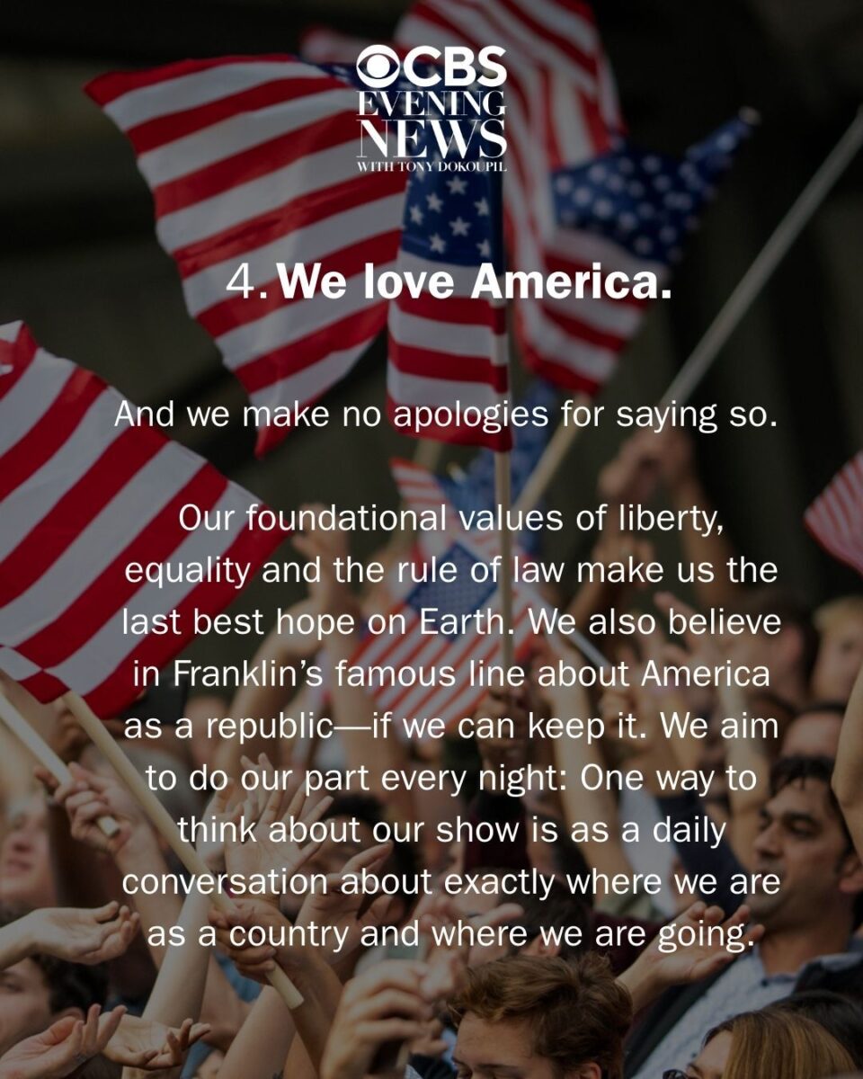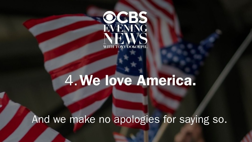 CBS Evening News relaunches Monday with a set of “five simple values” promoted across social media ahead of the debut. One has drawn outsized attention: “We love America. And we make no apologies for saying so.”
