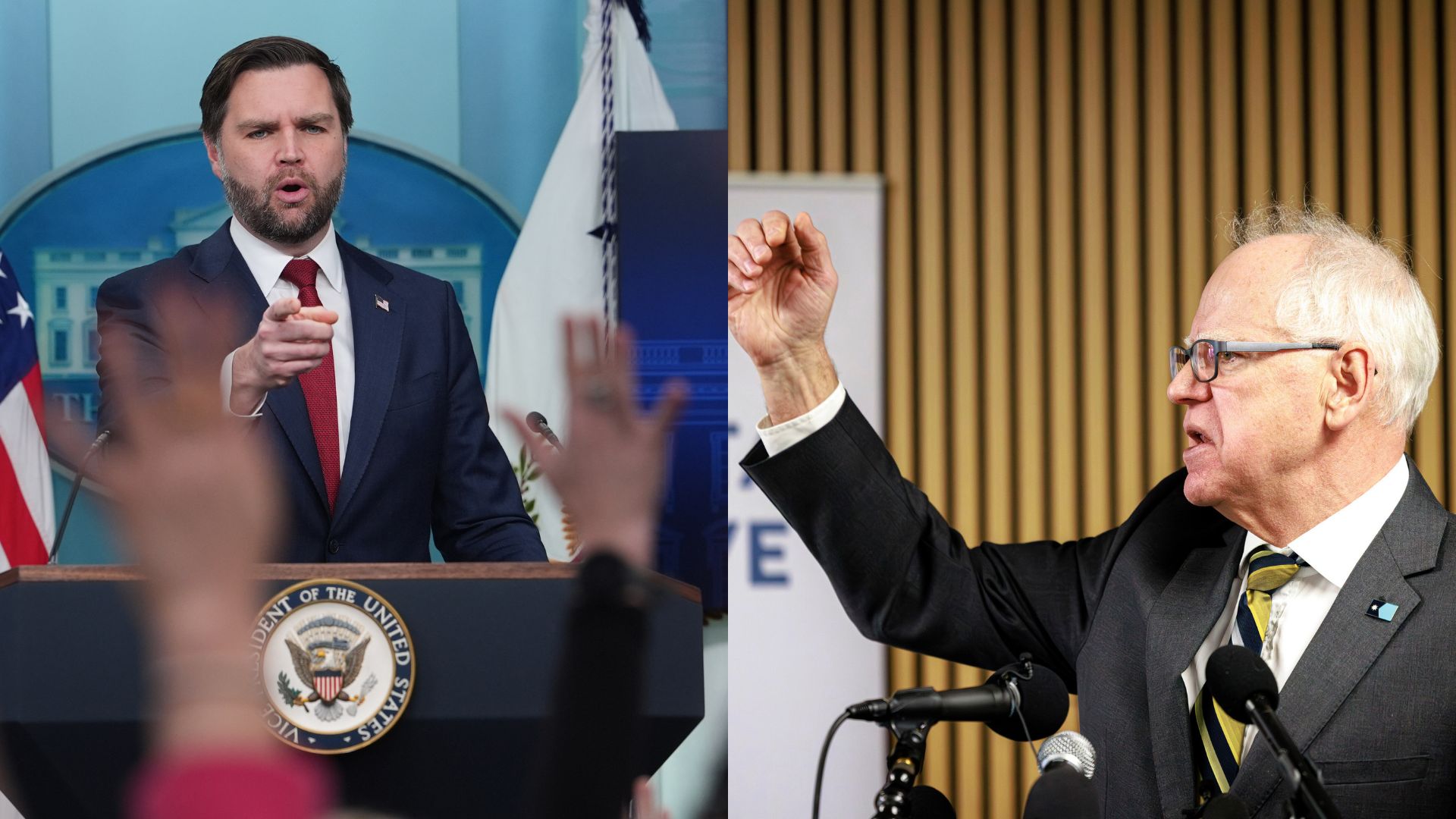 LEFT: JD Vance (AP Photo/Evan Vucci) RIGHT: Tim Walz (Kerem Yücel/Minnesota Public Radio via AP)
