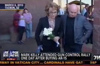 Gallagher then goes on to infer, deliberately or not (you decide) the motive of Mark Kelly’s revelation. “Earlier this month, you see it there,” Gallagher said, showing the photo that Mark Kelly posted, “he walked in a Tucson gun shop and bought, as you said, an AR-15 assault rifle and .45 caliber handgun. The next day he appeared at a gun control rally at the very same shopping plaza where his wife, Gabby Giffords was shot two years ago. Now, Breitbart.com was about to break the story of Kelly’s buying the assault weapon when Kelly posted on his Facebook page that he was turning the assault rifle in to Tucson police.”