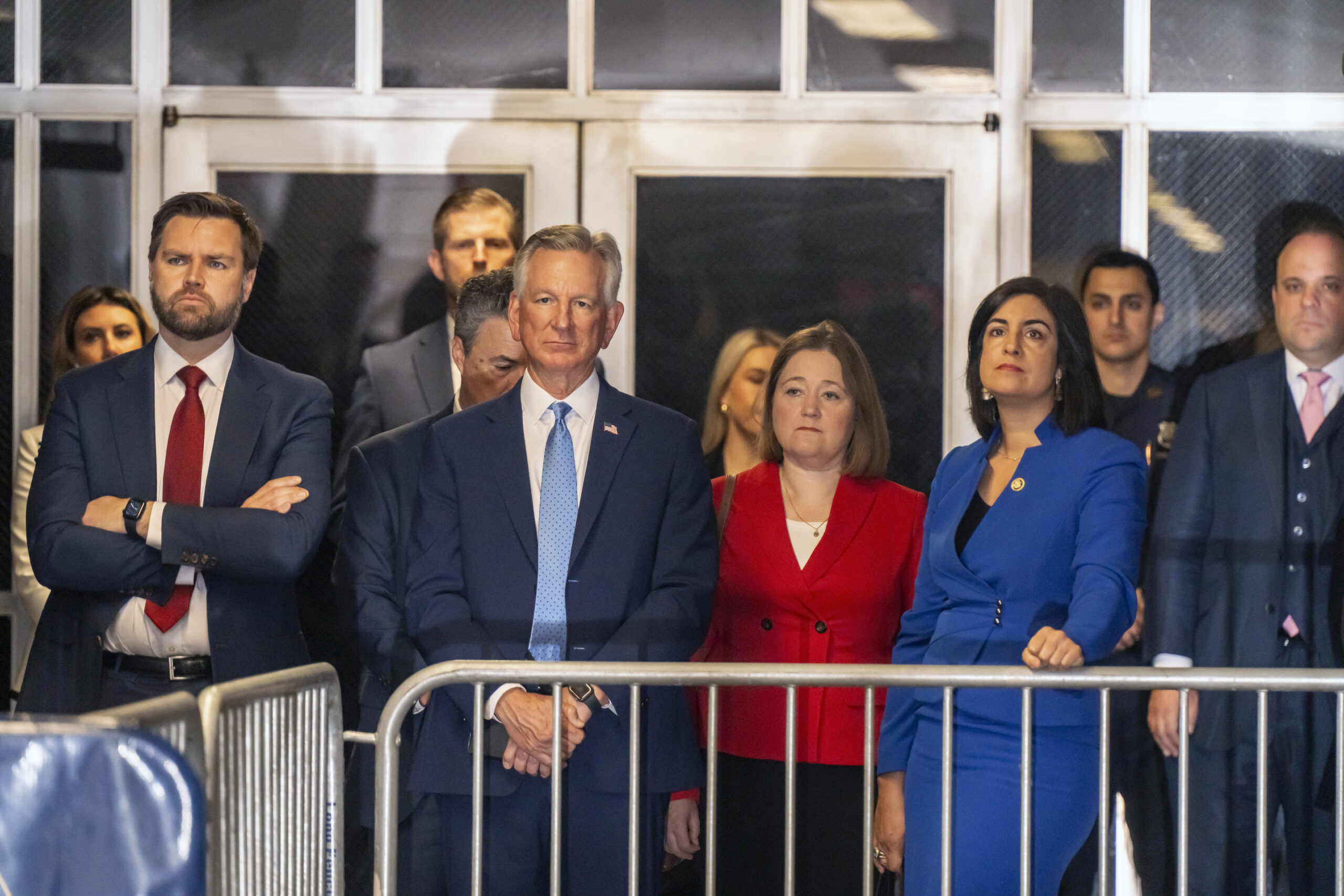 Six congressmen, one United States senator, and various other assorted Republicans joined former President Donald Trump in Manhattan court — where he faces falsification of business records charges pertaining to hush money payments he made to a porn star, Playboy model, and doorman — on Tuesday morning.