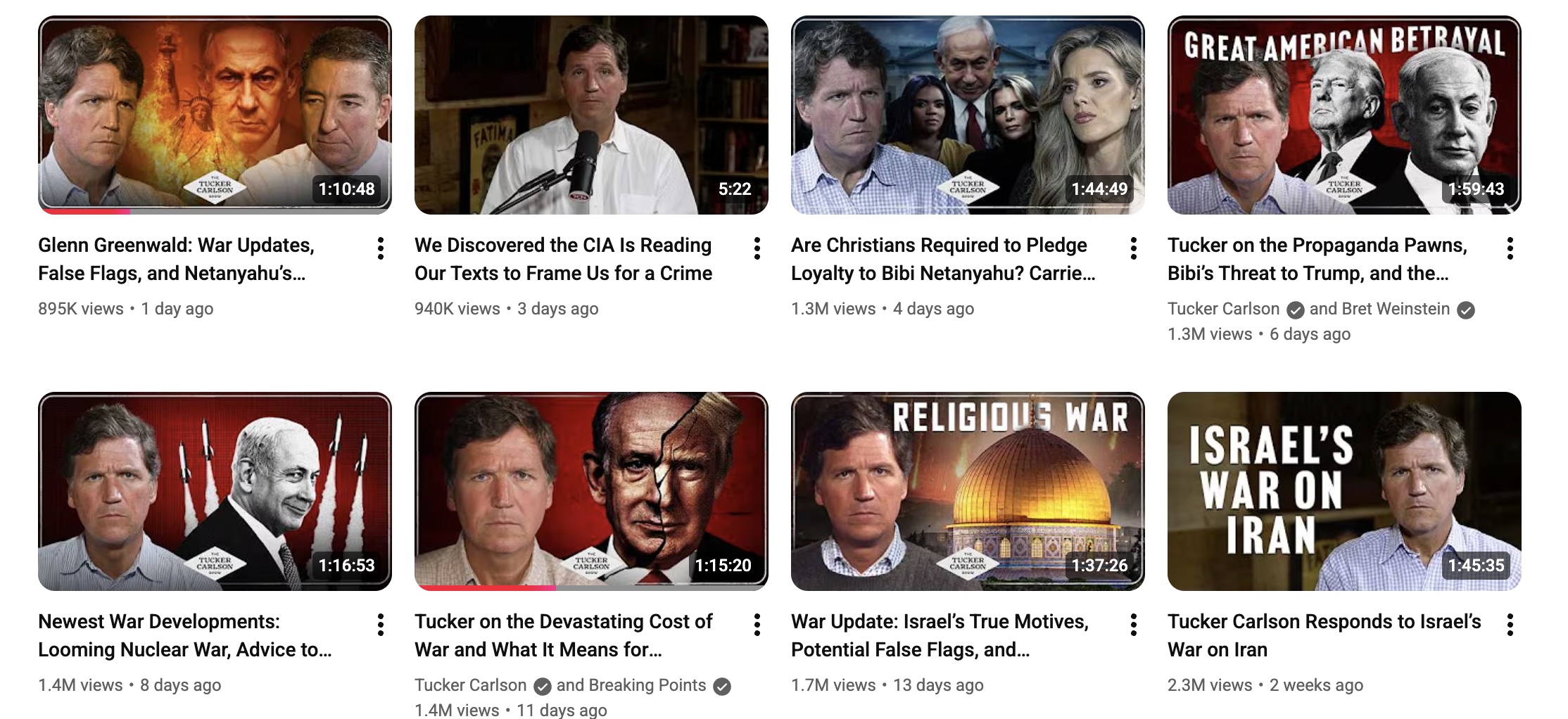 Tucker Carlson is worried about Americans being censored for criticizing Israel. But based on his YouTube output, it doesn’t look like that is much of an issue for him.