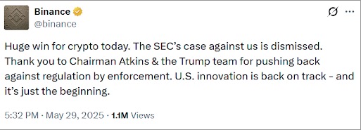 The SEC’s dropping of its litigation against Binance represents a lot of things, both directly related to Binance itself, as well as to the global crypto industry at-large. For starters, with this dismissal, the U.S. securities regulator is conceding that Binance is, far from falling behind compliance standards, is helping to set them. As Binance stated in a recent X post, “Thank you to Chairman Atkins & the Trump team for pushing back against regulation by enforcement. U.S. innovation is back on track.”