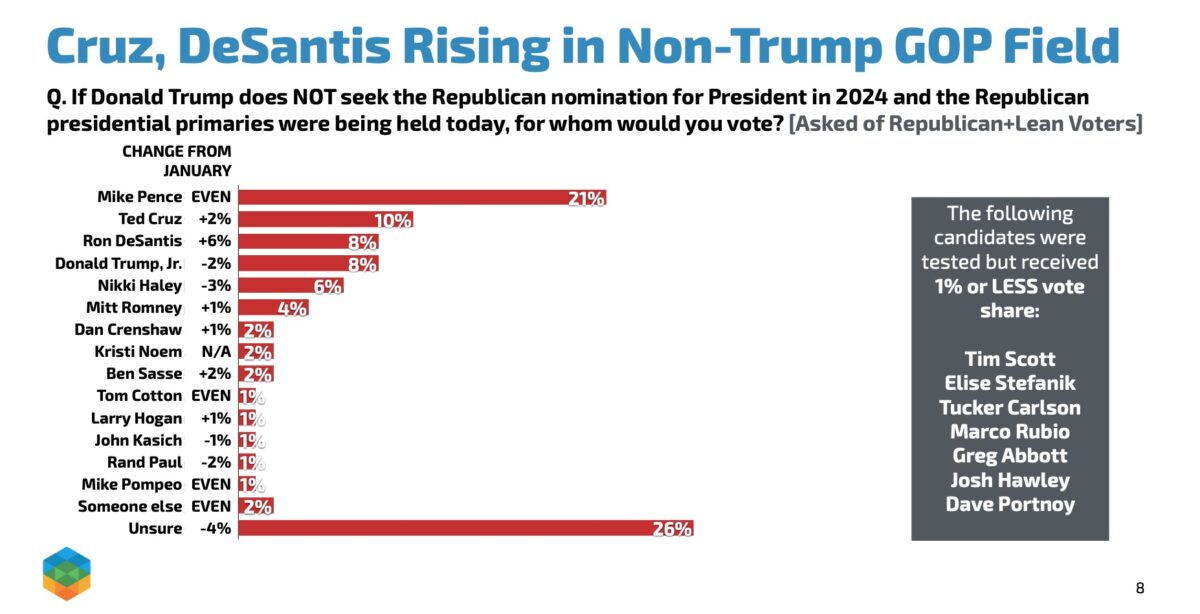 While 55 percent of Republican-leaning voters say they’d vote for Trump if the Republican primaries were being held today, respondents were also asked who they’d vote for if the former president chose not to run again. Texas Senator Ted Cruz and Florida Governor Ron DeSantis both seem to be possible contenders for 2024, but former Vice President Mike Pence more than doubles them both with a stable hold on 21 percent of the vote.