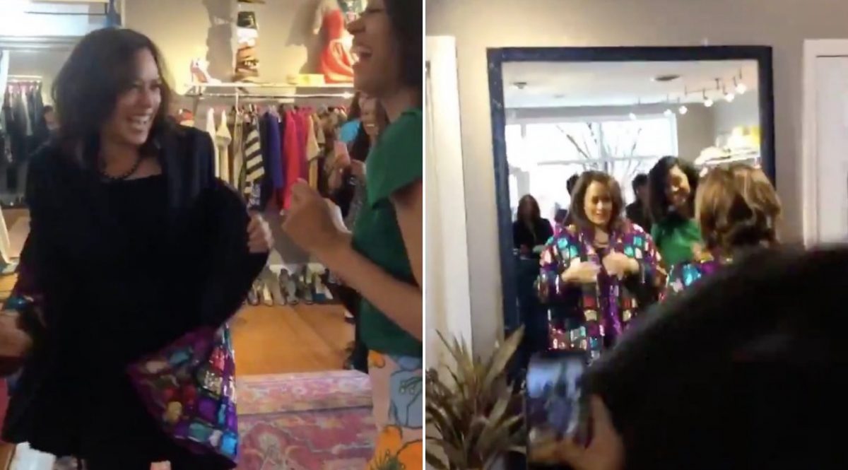 When the campaign trail takes you to a boutique, and @MaeveReston spots a great sequined jacket for @KamalaHarris to try on. #campaignfashionreport pic.twitter.com/38bYJKqjRI