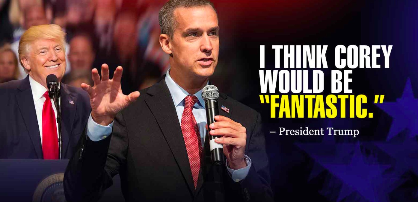 The website is simple: just a landing page with a giant photo of Lewandowski and his former boss, Donald Trump, along with a quote from the president: “I think Corey would be fantastic.”