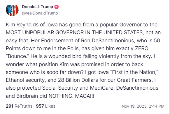 “Kim Reynolds of Iowa has gone from a popular Governor to the MOST UNPOPULAR GOVERNOR IN THE UNITED STATES, not an easy feat,” Trump raged in his second social media post of the day about the Iowa governor. “Her Endorsement of Ron DeSanctimonious, who is 50 Points down to me in the Polls, has given him exactly ZERO ‘Bounce.’ He is a wounded bird falling violently from the sky.”