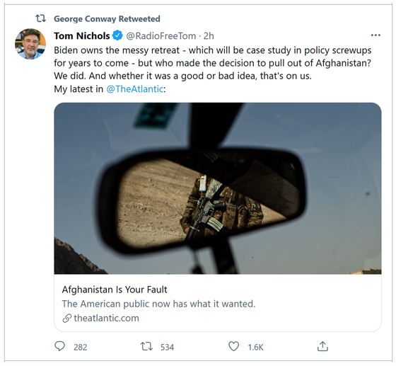 On Monday, George Conway jarringly but unironically offered a “pro” Donald Trump take on the subject of the ongoing and disastrous withdrawal of U.S. forces and personnel from Afghanistan.