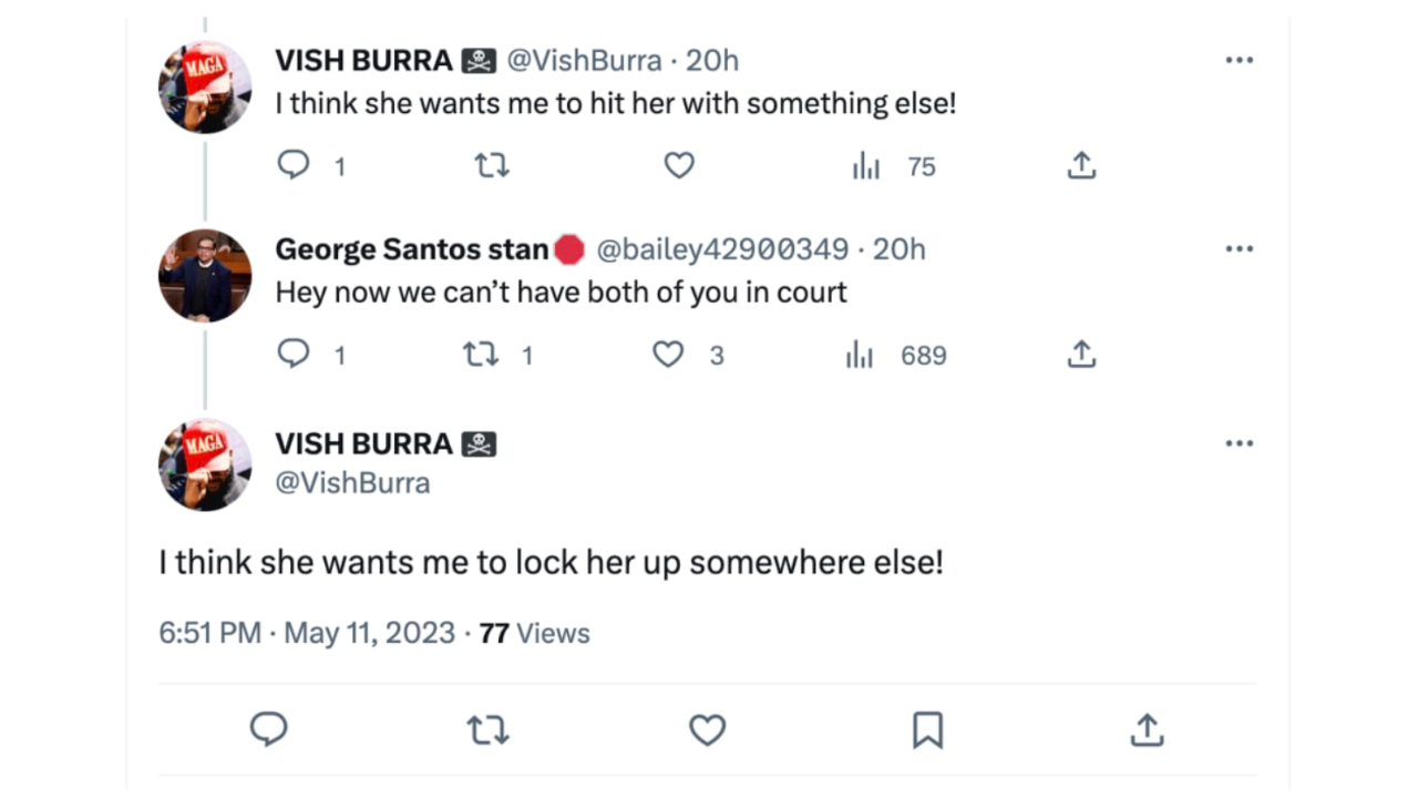 Burra also made suggestive comments about Sweet in a deleted thread interaction with Twitter user @GeorgeSantosstan.