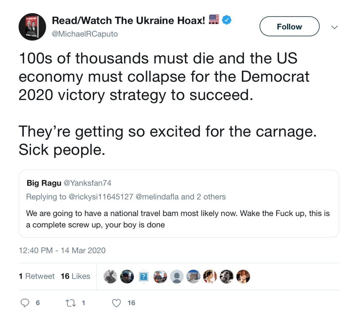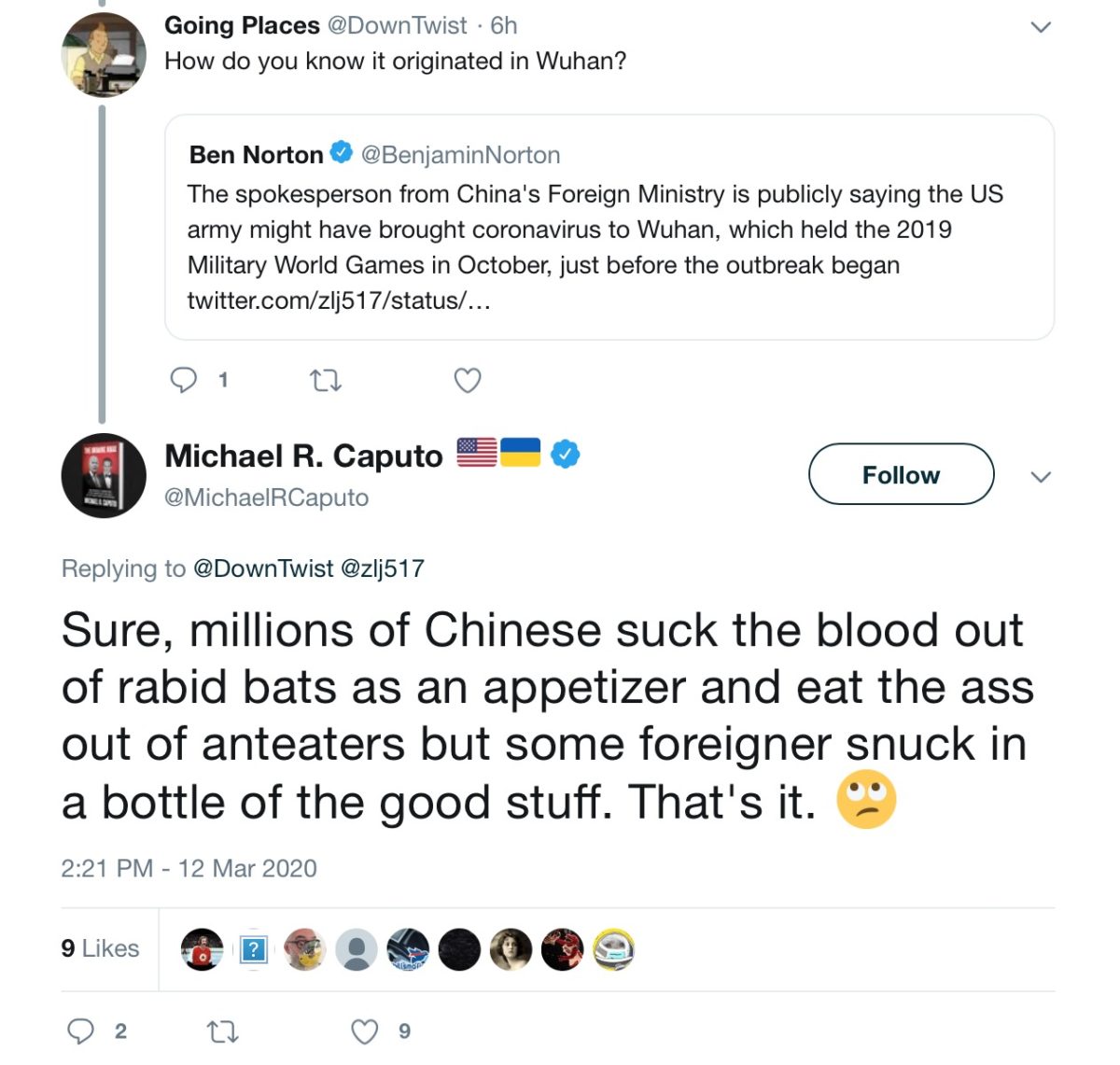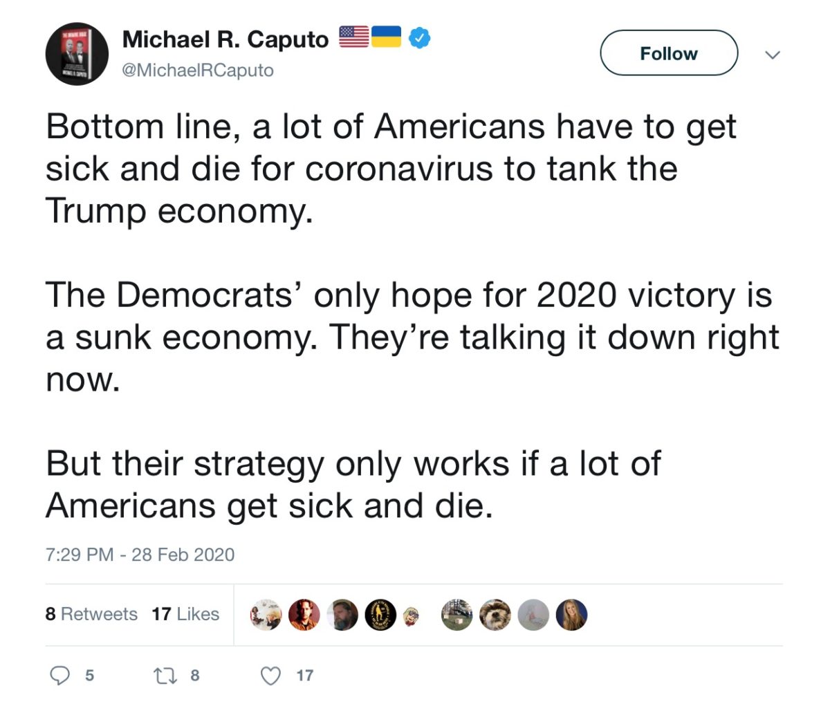 CNN’s KFile team compiled an archived list of Caputo’s tweets and retweets dating back to late February which have mysteriously disappeared from Twitter account. The trove is full of incendiary comments about the coronavirus, including racially-charged comments about Chinese people, a plethora of conspiracy theories, and accusations that Democrats were “excited” to see the virus bring about massive death so President Donald Trump would look bad. This leaves out all the insults, profanity and other less-than-eloquent statements he made in between.