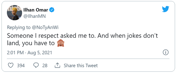After someone suggested she should not have deleted it, Omar said that she did so by request. And, she added, when a meme doesn’t land, sometimes it’s best to just ditch it. “When jokes don’t land, you have to ?.”