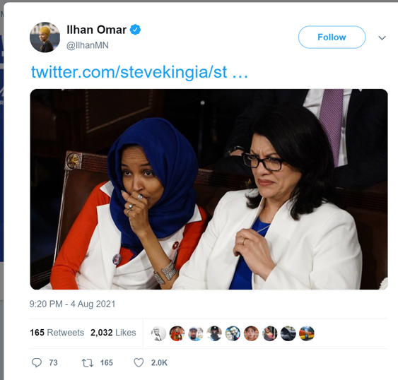 Omar quote retweeted that with a reaction shot featuring herself and Rep. Rashida Tlaib. Their expressions conveyed a sort of “omg” feel, or distaste with something. That tweet, though later deleted, was shared as a screenshot many times.