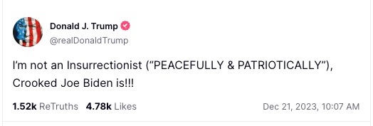 Trump appeared to respond directly to Biden’s claim Thursday morning, pulling out the old “best defense is a good offense” tactic, but this time with the kindergartner vibe. Trump wrote on social media: “I’m not an Insurrectionist (“PEACEFULLY & PATRIOTICALLY”), Crooked Joe Biden is!!!”
