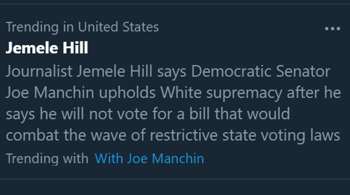 In a tweet that became a trending topic for hours, Hill accused Manchin of supporting the John Lewis Voting Rights Act because he’s a racist.