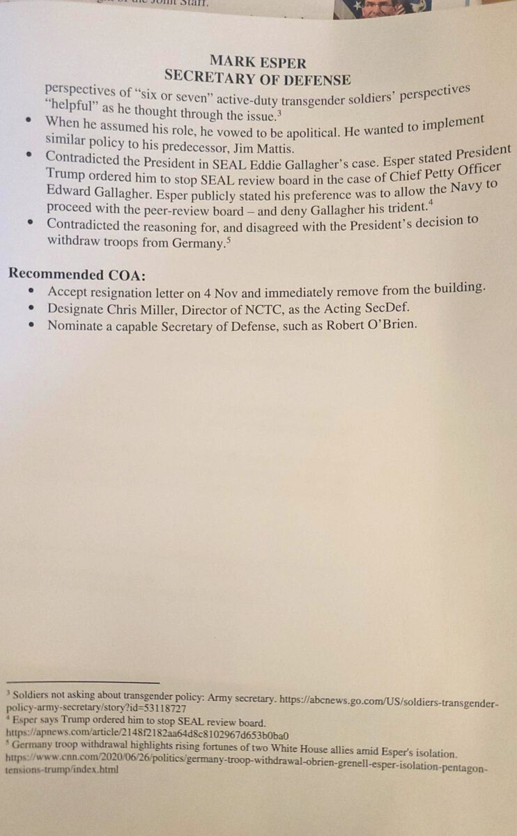 Karl’s follow-up is a PDF document that appears to be titled “Esper Termination” which was submitted by McEntee. The bullet-point document appears to be constructed from details gleaned from a fever dream of Lou Dobbs programming combined with analysis from OAN that was too strident for air.