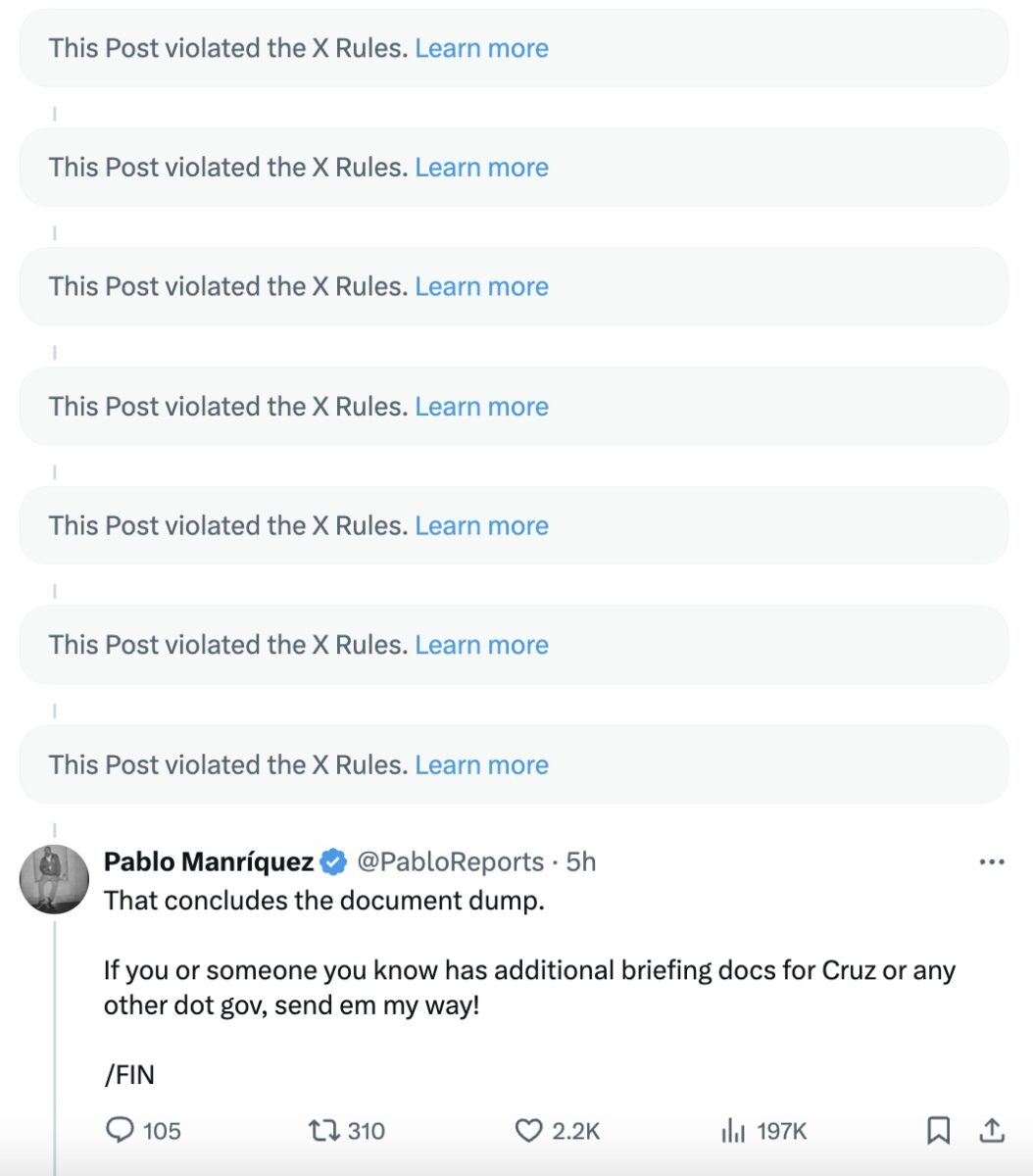 “That concludes the document dump,” read one of the few posts which X did not remove. “If you or someone you know has additional briefing docs for Cruz or any other dot gov, send em my way!”