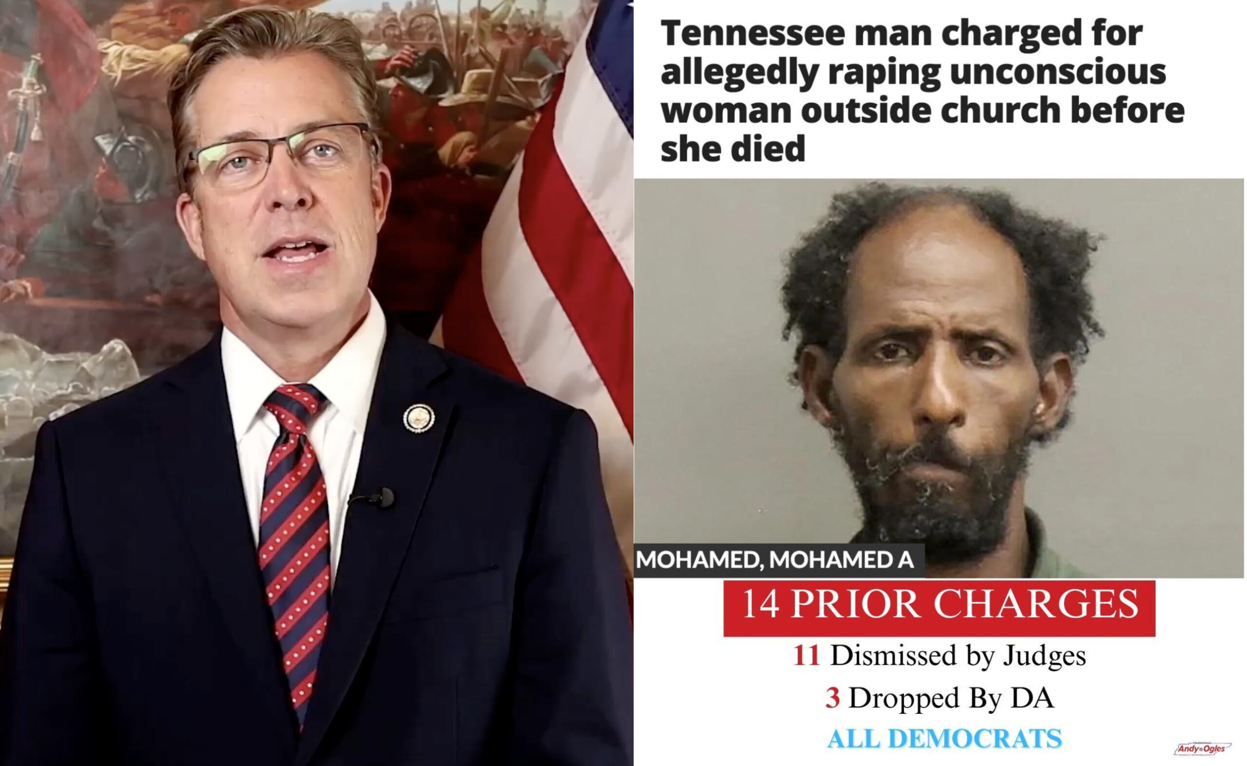 “Meet Muhammad A. Muhammad. He was recently caught allegedly RAPING a woman on the steps of a church on Nolensville Road in Nashville. He is a Somali migrant let in by Obama,” wrote Ogles in his social media post: