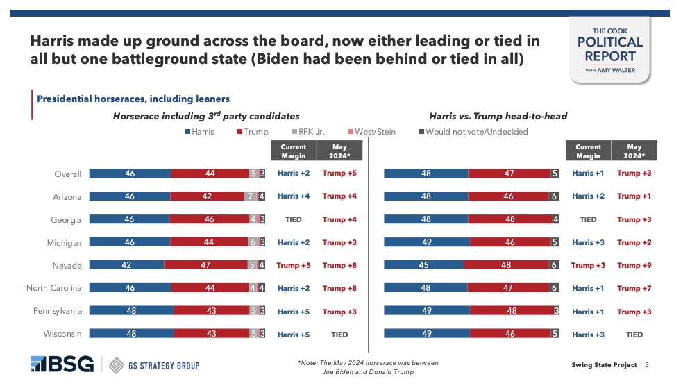 A new Cook Political Report Swing State Project Survey conducted by BSG and GS Strategy Group shows Vice President Kamala Harris leading or tied with former President Donald Trump in all but one of the seven battleground states. Overall, she holds a narrow lead of 48% to 47% in those states in the head-to-head.