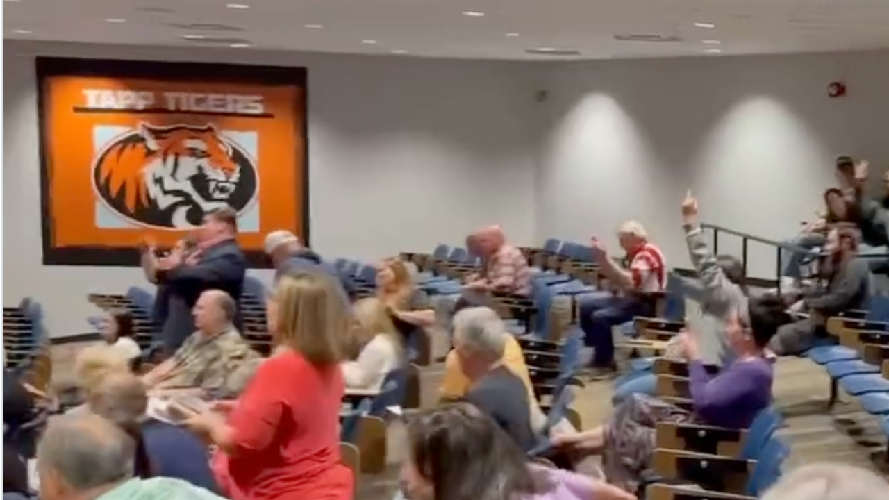The video featured a semi-filled middle school auditorium giving a standing ovation as Greene wrapped up her speech. But in the corner, one man stayed sitting and proudly displayed a middle finger toward the stage.