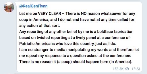 “Let me be VERY CLEAR – There is NO reason whatsoever for any coup in America, and I do not and have not at any time called for any action of that sort,” Flynn said.