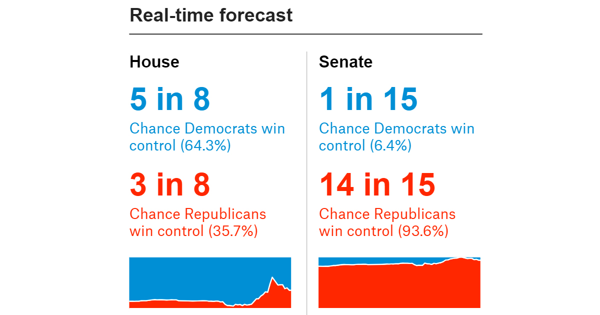 FiveThirtyEight’s realtime tracker has just made a drastic revision to the predictions for tonight’s midterm elections, showing the House currently up for grabs.