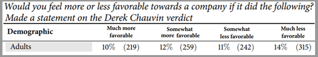 Overall, among adults the results show that just 10% gain a “much more favorable view” of a company for making a statement on the verdict, and 12% “somewhat” more favorable.