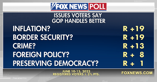 A new poll from Fox News this week has American voters despairing about the economy, almost universally stressed about gas prices, and answering that Republicans would do a better job handling those issues better than Democrats — not to mention the task of “preserving democracy.”