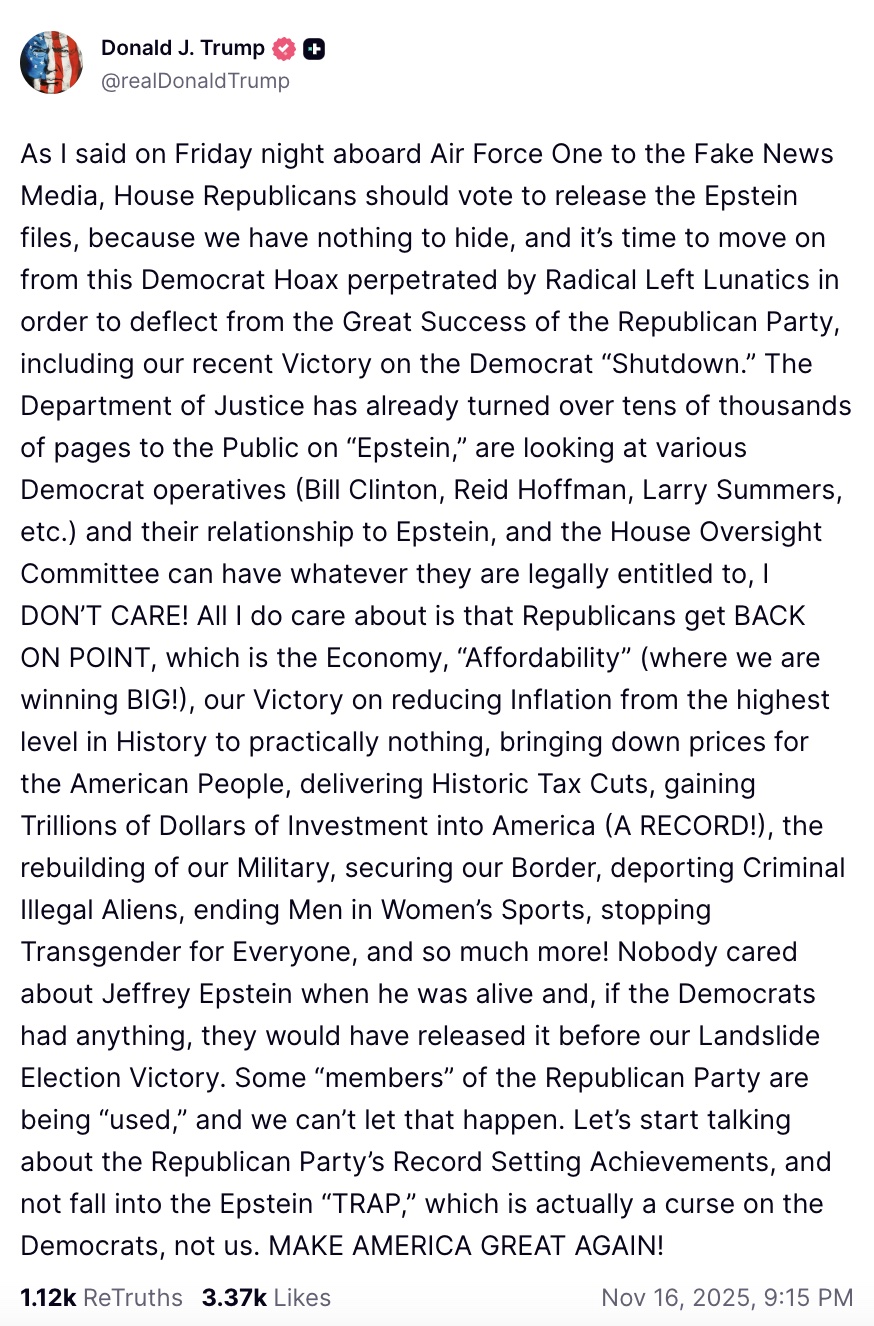 House Republicans should vote to release the Epstein files, because we have nothing to hide, and it’s time to move on from this Democrat Hoax perpetrated by Radical Left Lunatics in order to deflect from the Great Success of the Republican Party, including our recent Victory on the Democrat “Shutdown.”