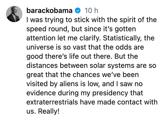 Obama Issues Follow-Up After Head-Turning Claim Aliens Are ‘Real’ Ignites Online Frenzy