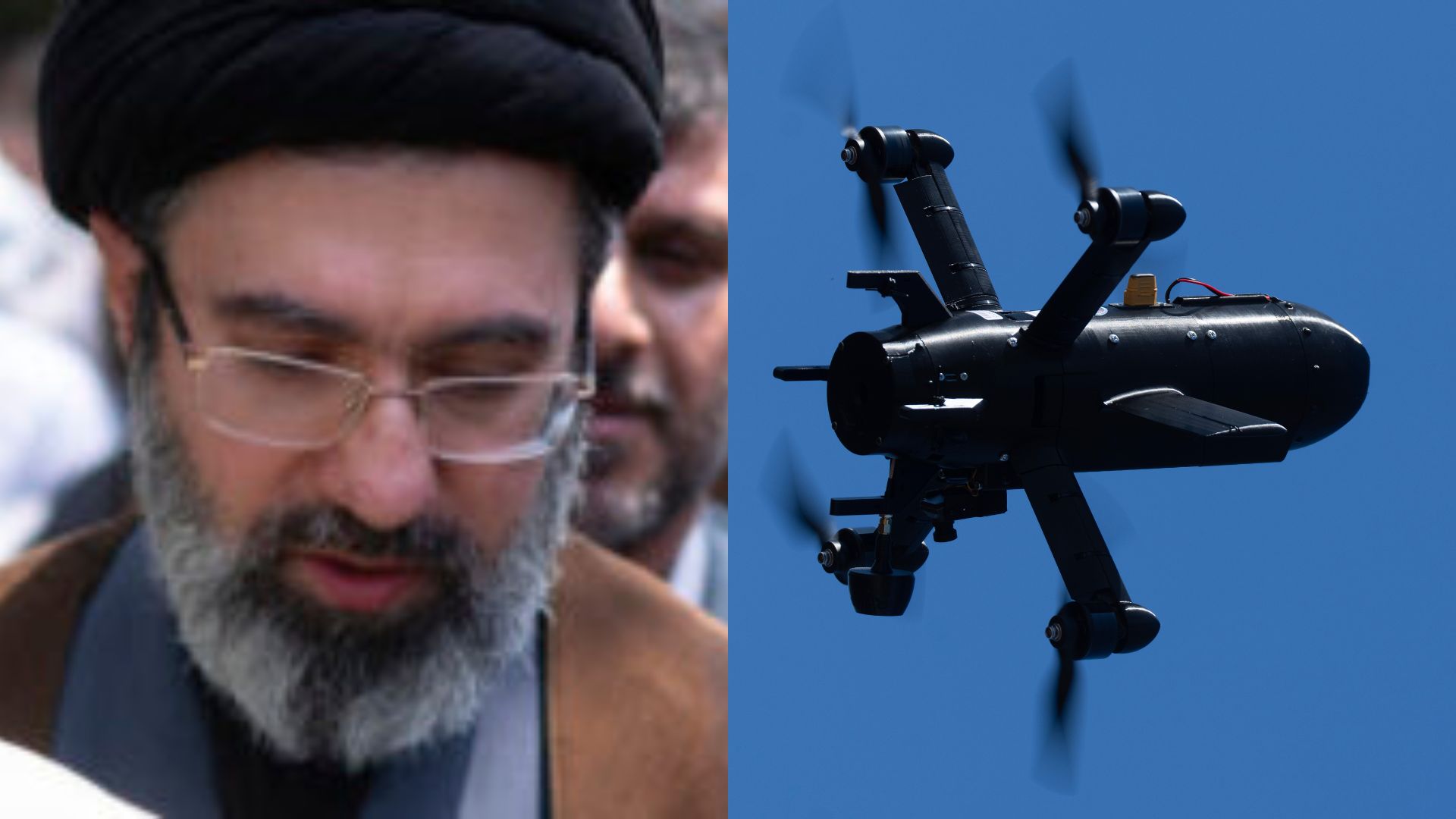 Left: Mojtaba Khamenei (Photo by Morteza Nikoubazl/NurPhoto via AP) RIGHT: Ukrainian anti-air interceptor drone (AP Photo/Efrem Lukatsky)