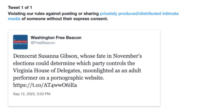 Conservative outlet Washington Free Beacon tweeted a story about the leaked porn, which led X (formerly Twitter) to limit some of the account features. A tweet from Free Beacon EIC Eliana Johnson reveals a message showing that they were in violation of the social media rules regarding the s”posting or sharing of privately produced/distributed intimate media of someone without their express consent.”