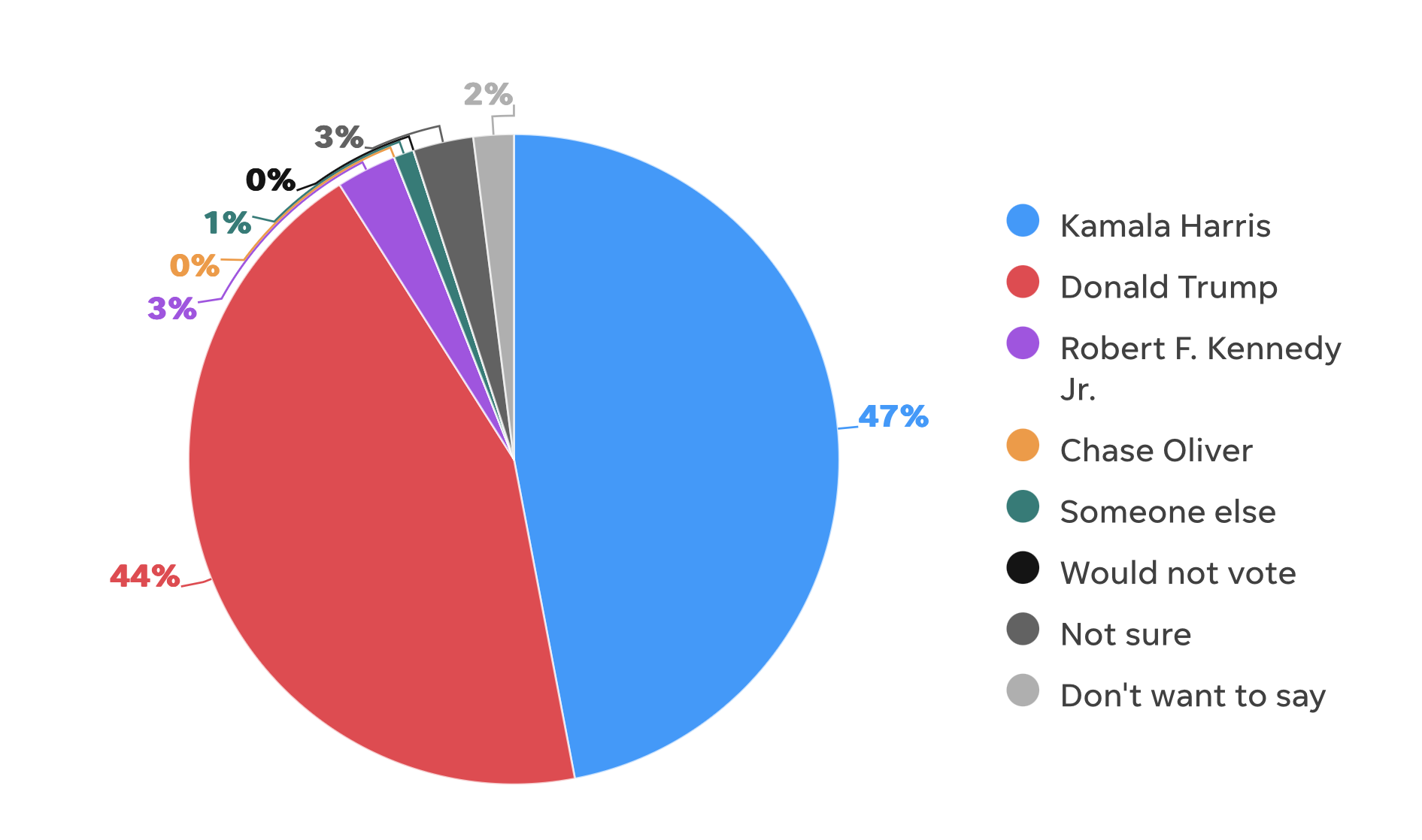 A new Des Moines Register/Mediacom Iowa Poll shows Vice President Harris leading former President Trump 47% to 44% among likely voters just days before a high-stakes election that appears deadlocked in key battleground states.