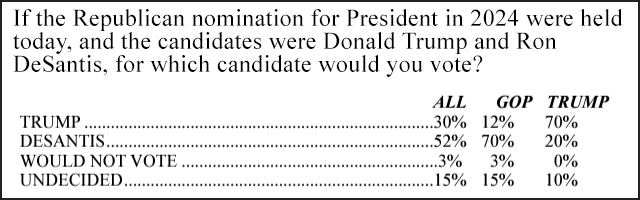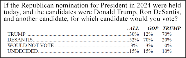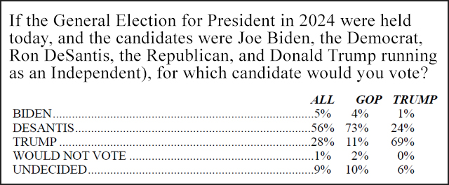 A new national GOP poll published on Tuesday has Florida Gov. Ron DeSantis beating ex-president Donald Trump by a whopping margin, but a dismayingly large percent of Trump loyalists saying they’d vote for him if he staged an independent spoiler run.