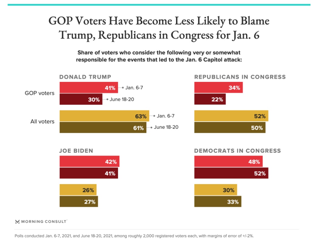 A new Morning Consult poll looks at the events of January 6th six months later and reveals stunning information about the current politics surrounding that fateful date in which Trump supporters attacked the Capitol in an attempt to overturn the general election.