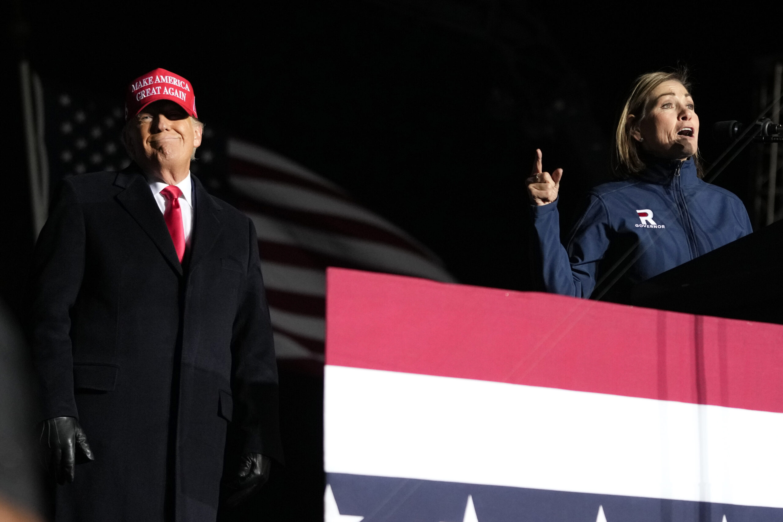 Former President Donald Trump watches as Iowa Gov. Kim Reynolds speaks during a rally, Thursday, Nov. 3, 2022, in Sioux City, Iowa. (AP Photo/Charlie Neibergall)