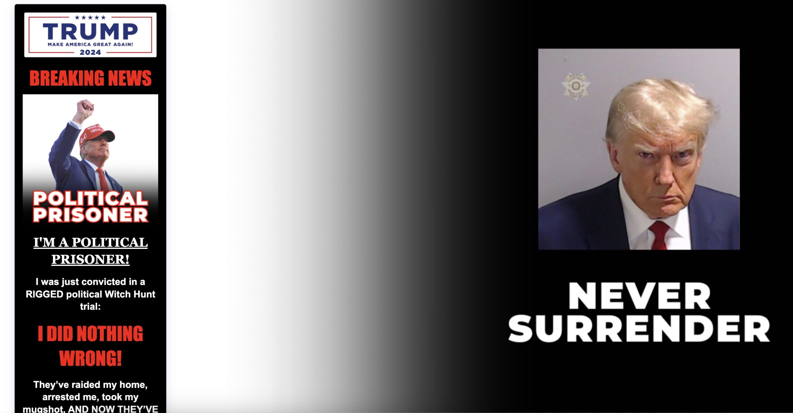 The page was accompanied by Trump’s 2023 Georgia mugshot, along with the slogan, “NEVER SURRENDER.”