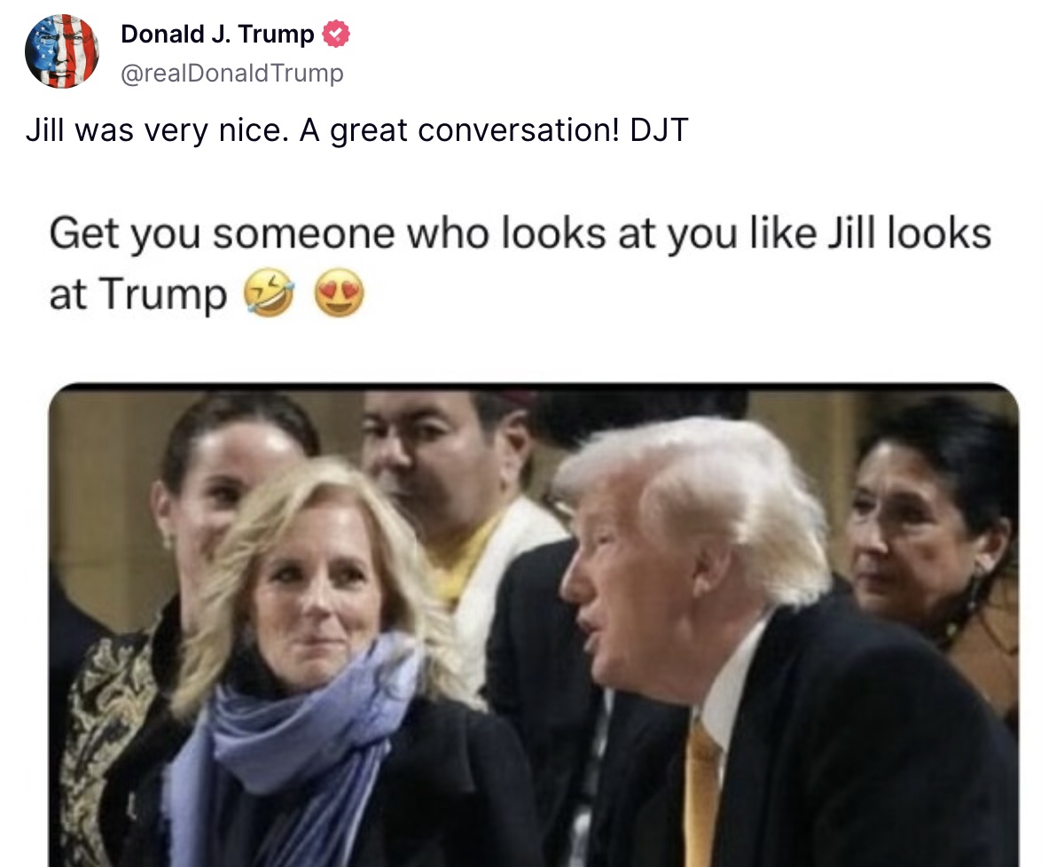 On his Truth Social page, Trump posted a photo of Biden looking at him, along with a heart-eye emoji and the caption, “Get you someone who looks at you like Jill looks at Trump.”