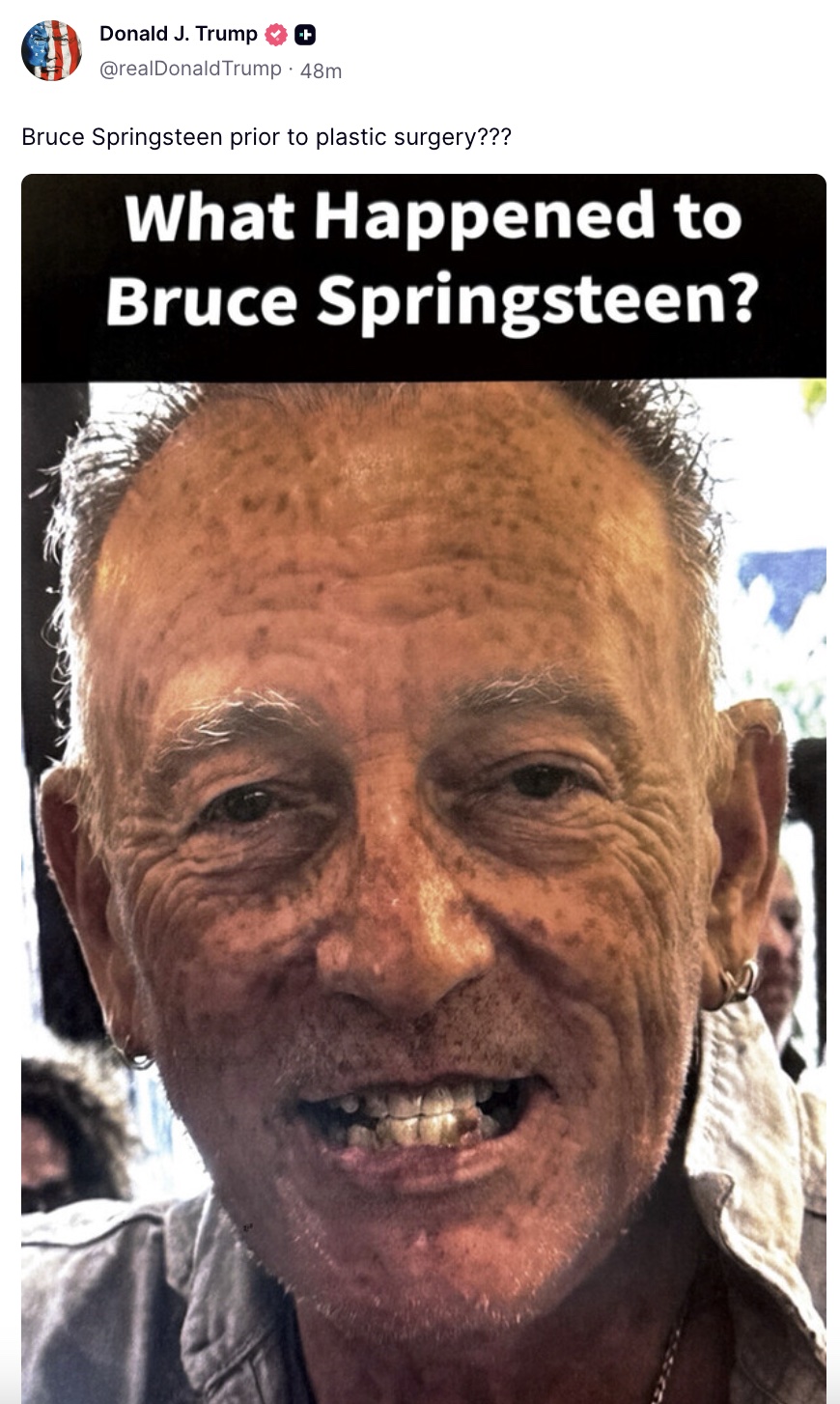 Trump’s post showed a close-up of Springsteen with a toothy smile and a combined three earrings between both ears; The “Born in the USA” singer’s skin isn’t looking amazing in the pic, either. The president’s post included the caption “Bruce Springsteen prior to plastic surgery???”
