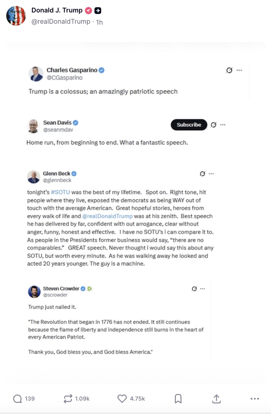 Trump also highlighted a post from New York Post reporter Charles Gasparino that hailed him as a “colossus” who gave an “amazingly patriotic speech.”
