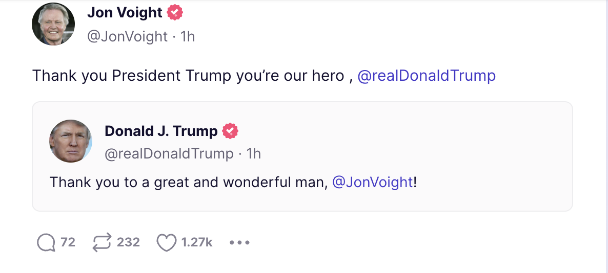 Voight responded in kind, telling Trump, “you’re our hero.”