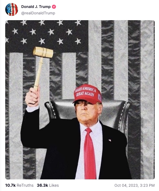 In one Truth Social post, Trump shared an edited photo of himself holding the speaker’s gavel.