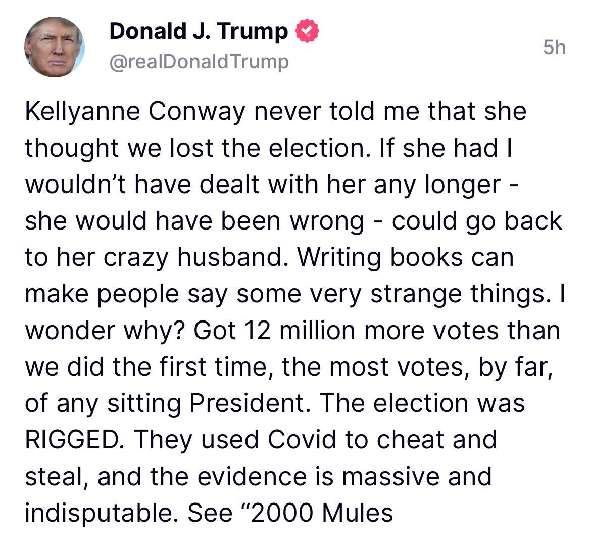 “Kellyanne Conway never told me that she thought we lost the election,” Trump wrote.