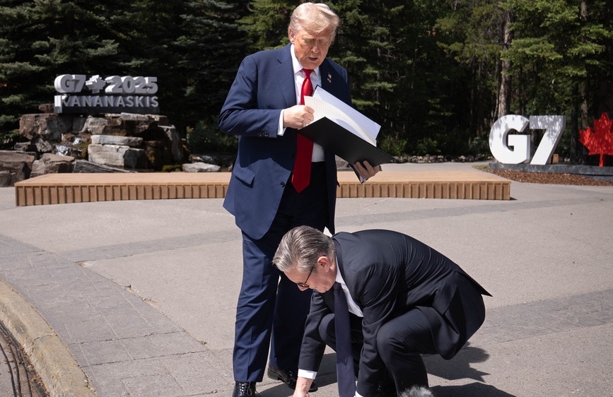 Prime Minister Sir Keir Starmer picks up UK-US trade deal papers dropped by US President Donald Trump before speaking to the media at the G7 summit in Kananaskis, Alberta, Canada. (Photo Credit: Stefan Rousseau / Press Association via AP Images)