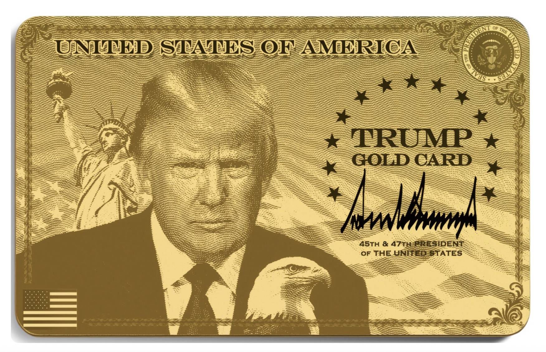 The card — which is, as the name suggests, gold — prominently features a stern-looking Trump; he is flanked by the Statue of Liberty and a bald eagle, while the American flag is in the bottom left corner.