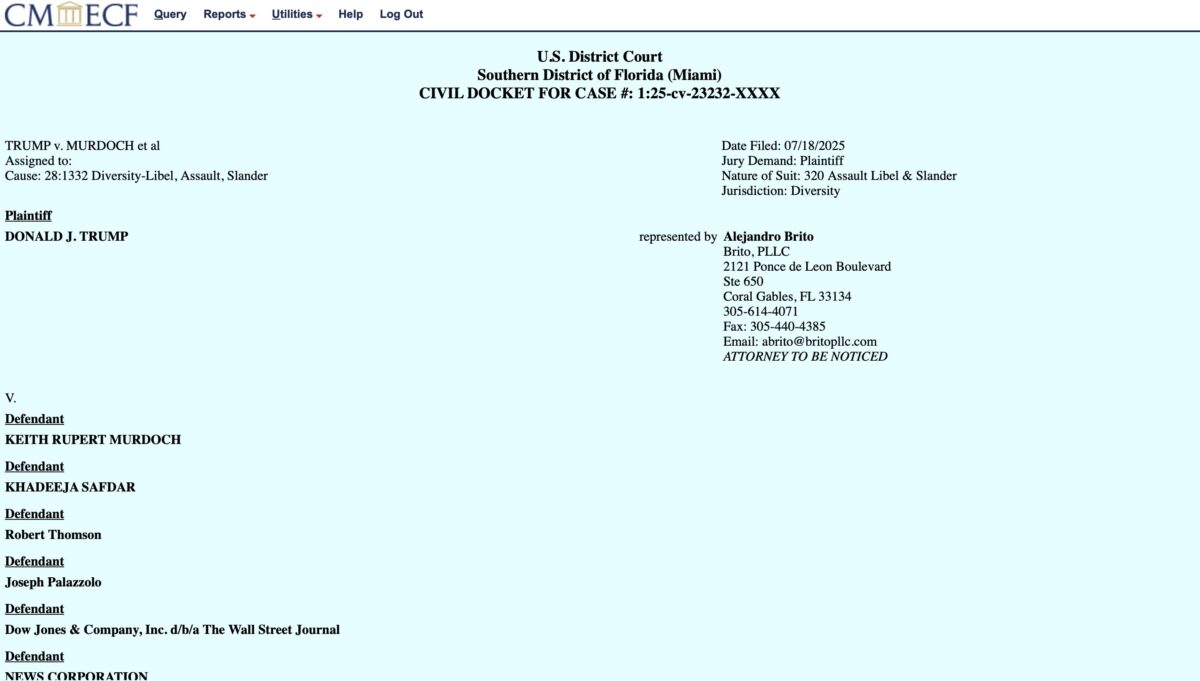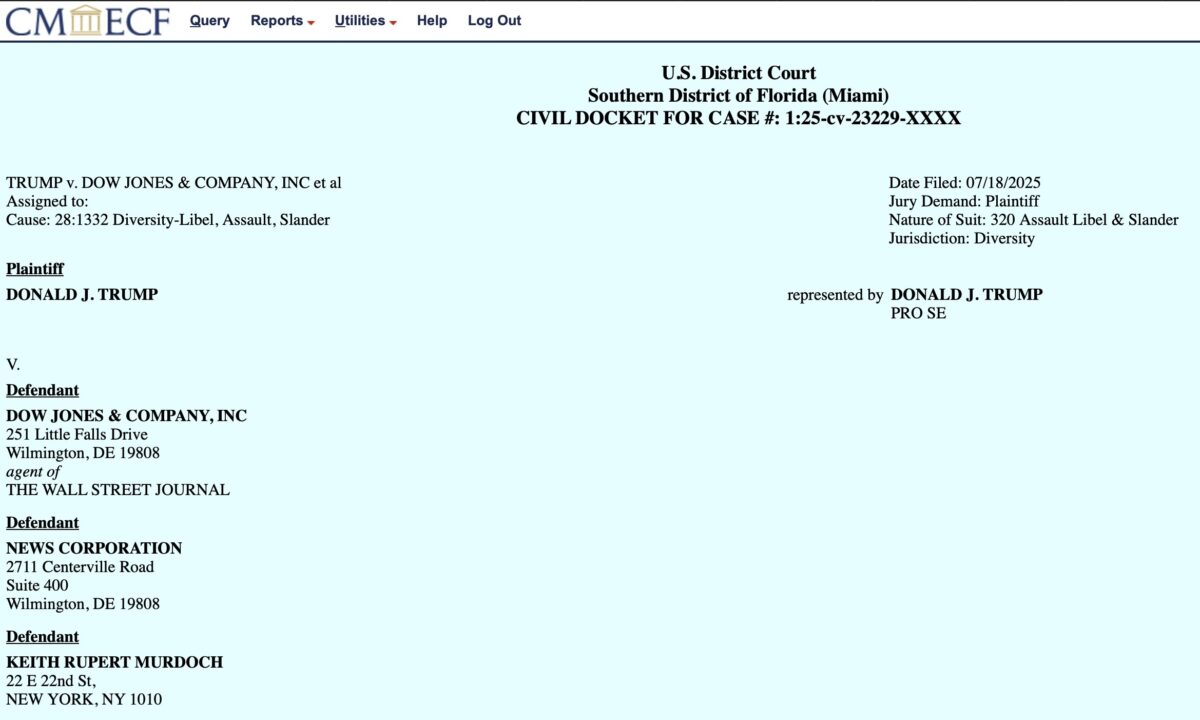 As of 6:00 pm ET, the Public Access to Court Electronic Records (PACER) website, which provides public access to federal court records, had a docket entry for case no. 1:25-cv-23229 but did not yet have a complaint posted. The PACER docket entry confirms that the lawsuit was filed Friday afternoon in the U.S. District Court for the Southern District of Florida with Donald J. Trump as the plaintiff, and defendants Dow Jones & Company, Inc., News Corporation, Keith Rupert Murdoch, Khadeeja Safdar, and Joe Palazzolo.