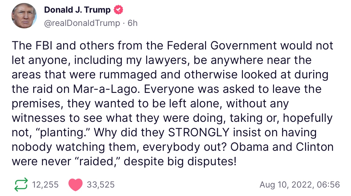 “The FBI and others from the Federal Government would not let anyone, including my lawyers, be anywhere near the areas that were rummaged and otherwise looked at during the raid on Mar-a-Lago,” Trump wrote. “Everyone was asked to leave the premises, they wanted to be left alone, without any witnesses to see what they were doing, taking or, hopefully not, “planting.” Why did they STRONGLY insist on having nobody watching them, everybody out? Obama and Clinton were never “raided,” despite big disputes!”